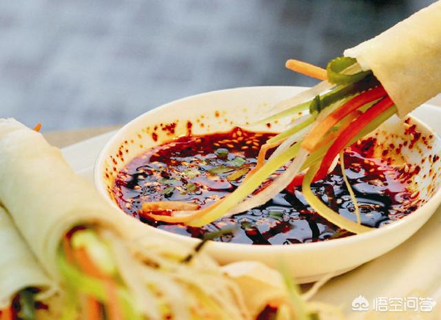 成都街头过去一种春卷速食法,先将春卷裹卷为圆锥体交给顾客,然后从敞口处浇淋各种调料。春卷整齐摆放在小盘里,配以酱油、食醋、辣椒油;还可以将红橘子皮洗净熬汁作辅料,柑橘皮特有的浓郁香气,又使春卷别有一番滋味,春卷才真正诠释什么叫“有容乃大”。