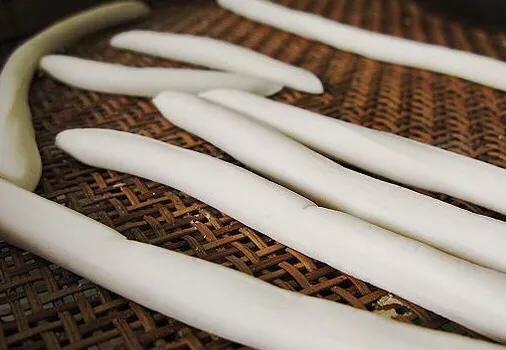 3、将面团按扁,用擀面杖擀平后切成长条,再将一根根长条搓成大拇指粗细的圆条。