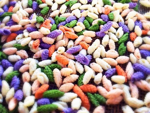 现在,在浦江乡下,即使不干农活的人家,也大多会保留一个米筛,为的就是方便制作这道独特的美食“米筛爬”。而且浦江人还用各种各样的蔬菜汁代替水混合在面团中,做出了各种色彩的米筛爬,仅仅是看着,就已经是一种享受了。