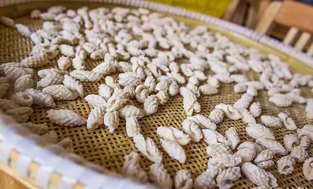 4、揪下拇指长短的面团,将其一个个按到米筛上,摁着往前滚压一下,好看的花纹就出来了。