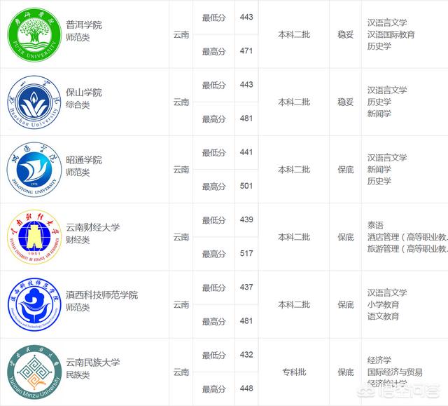保底型可以录取的大学有昭通学院、云南财经大学(注意专业方向)、滇西科技师范学院等等多个院校,不一一例举。专业可以查看以下表格: