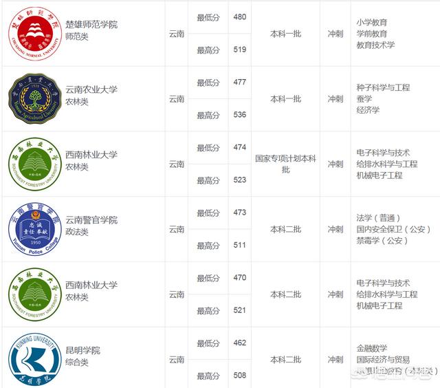 “冲刺”型录取的大学是楚雄师范学院、云南农业大学、西南林业大学、云南警官学院、昆明学院。专业有小学教育、学前教育、教育技术学、种子科学与工程、电子科学与工程、机械电子工程等等几十个专业。