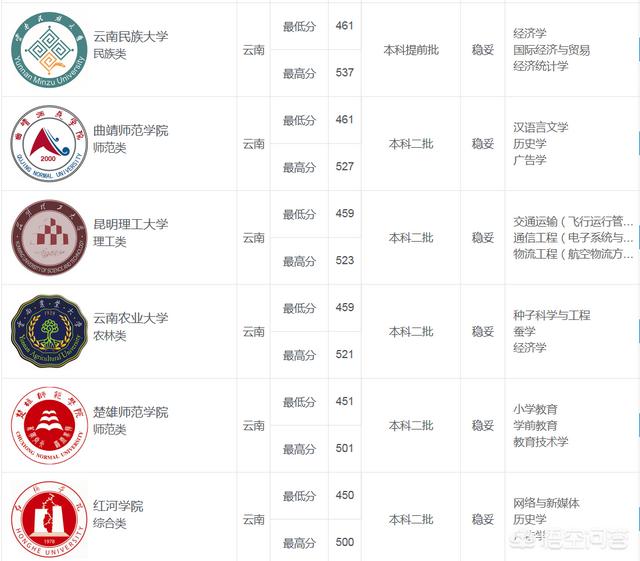 稳妥型可以录取的大学有云南民族大学、曲靖师范学院、昆明理工大学、红河学院、普洱学院、保山学院等大学。专业可以参考以下表格: