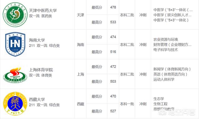 1.可冲一冲录取两所“211工程”大学,这两所大学是海南大学、西藏大学,同时这两所大学也是双一流大学 。专业有农业资源与环境、账务财务管理、电子科学与技术、生态学、生物工程等专业。不过,录取这两所大学是属于“冲刺”录取,有比较高的风险。详情可以看以下表格数据: