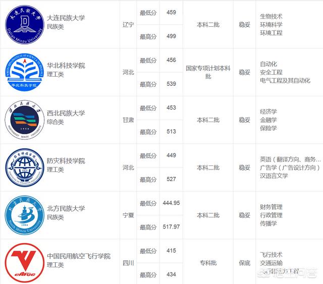 3.中央部委大学有6所可以考虑,他们是大连民族大学、华北科技学院、西北民族大学、防灾科技学院、北方民族大学、中国民用 航空飞行学院。专业有生物技术、环境科学、环境工程、自动化、安全工程、电气工程及其自动化、经济学、金融学、保险学、财务管理、飞行技术、交通运输、飞行器动力工程等等专业可挑选。而且录取类型为“稳妥”型,风险较小。这6所大学应该是云南理科500分考生重点考虑的方向。