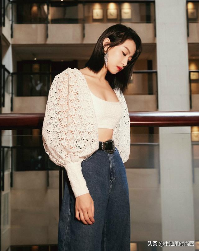 羊腿袖宫廷风短款上衣,搭配直筒阔腿牛仔裤,隔着屏幕都能feel到那股复古风。