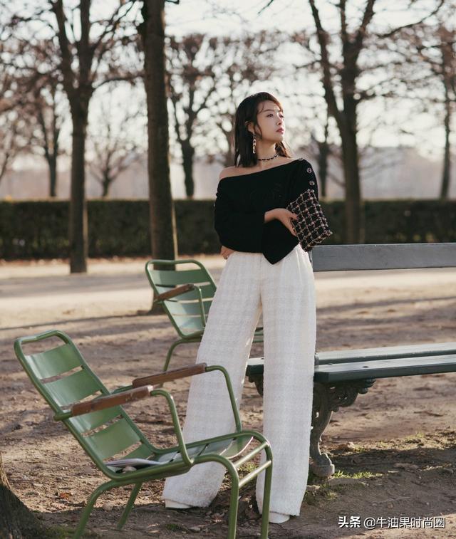 身着CHANEL 2020春夏预告系列针织上衣,搭配斜纹软呢阔腿裤和黑色手袋,黑白相称飒爽典雅,干练从容;