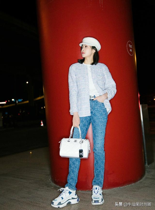 CHANEL斜纹软呢外套搭配蓝色牛仔裤+运动鞋,白色贝雷帽和手提袋点缀,真是贵气优雅girl~