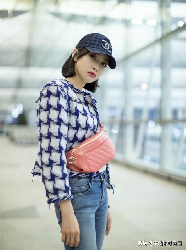 CHANEL斜纹软呢外套搭配牛仔裤,搭配粉色皮质腰包和棒球帽,优雅感爆棚的茜总。