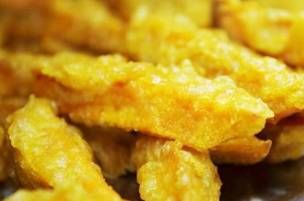 然后弄成红薯条,外面裹上面包糠,刚入3–4成热的油锅中,小火炸至金黄即可。