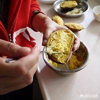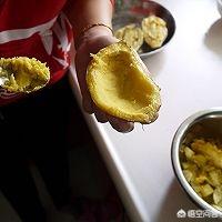 3. 红薯蒸熟后,用小勺子挖出中间的红薯泥,放进黄油芝士混合物中。不要挖太干净,留个3-4毫米宽的边缘,否则红薯边太薄的话容易变形。