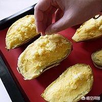 4、搅拌好的红薯肉酿回红薯托中,表面撒芝士