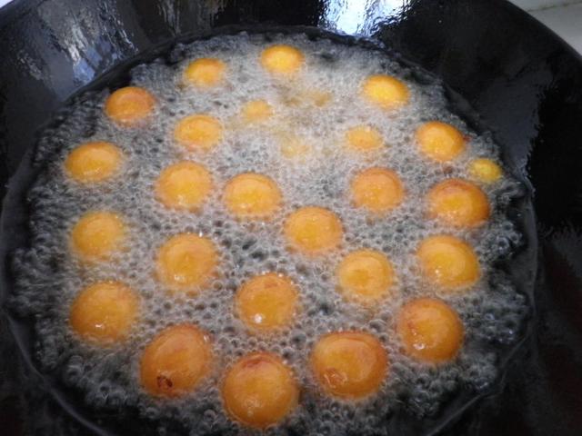 5,搅动至,个个开始沸起,改小火慢慢炸,时不时用陋勺抹动丸子,炸至金黄色即可捞出控油。
