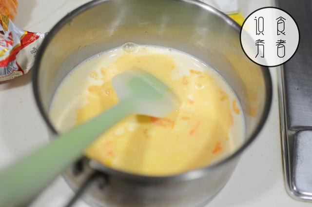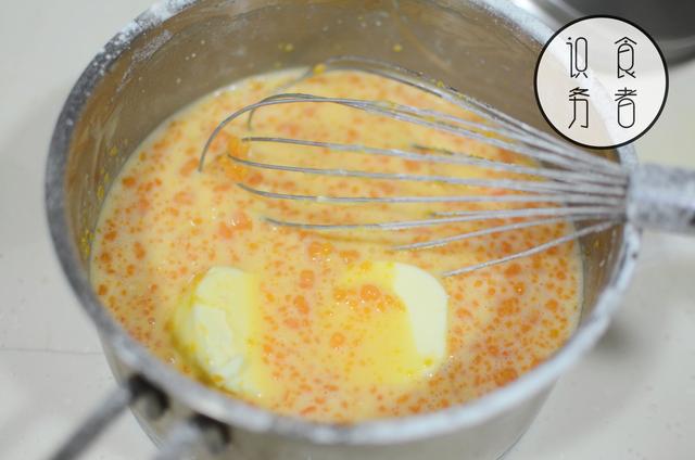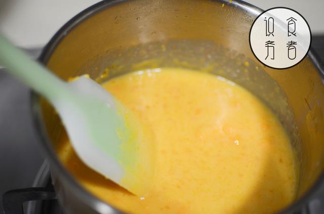 加入45g咸蛋黄碎及泡软的7.5g吉利丁片。