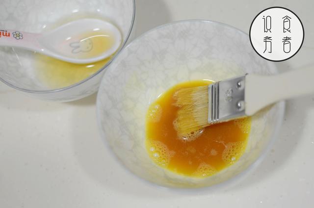 第一次烤6分钟后,拿出来,将轻轻刷一层蛋黄(蘸料1),然后重新放回烤箱。
