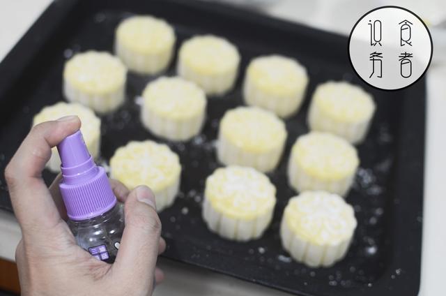 6、将烤盘放入事先180℃预热好的烤箱,月饼表面喷上少许水,这样可以预防月饼在烤的过程中表皮开裂