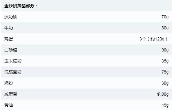 关于配料表里面金沙奶黄馅、流心馅用到的咸蛋黄加起来约135g,其实不用那么精准,你拿10个咸蛋黄出来就差不多了。