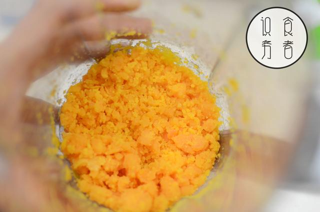 把半熟的咸蛋黄,放进搅拌机里打碎,并按1/3与2/3分好备用。