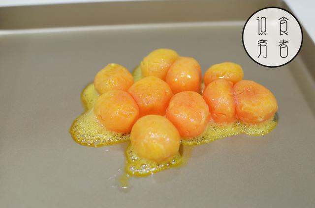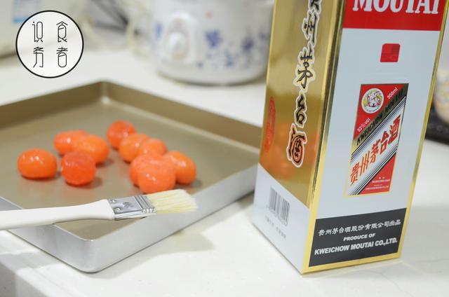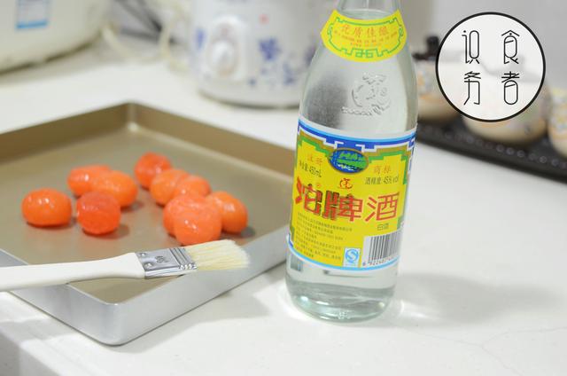 咸蛋黄一般买回来都是生的,所以要烤熟。表面沾点白酒,放烤盘中180°烤10分钟。