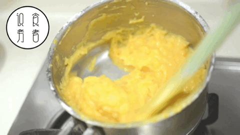 小火不停搅拌至金沙奶黄馅成团,即可关火。如果怕火候控制不好,这个步骤可以隔水加热进行。