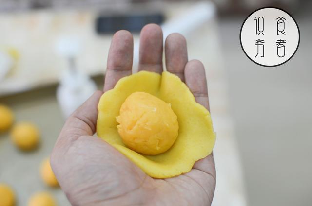 因为流心馅是比较湿的,烤制的时候会爆浆爆的满地都是,所以要有一层金沙奶黄馅先裹着。