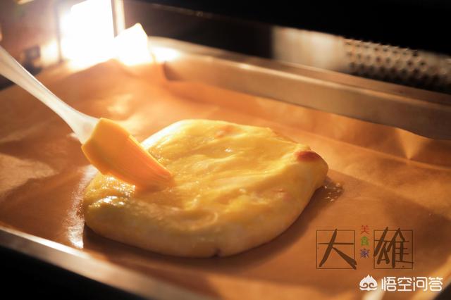 7.烤箱预热190度,先烤10分钟,取出后在饼表面刷一层蛋黄液,再入烤箱,烤12分钟。注意是蛋黄液不是全蛋液。