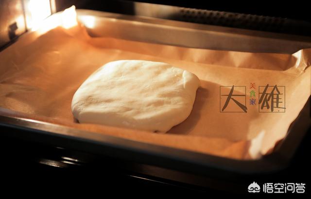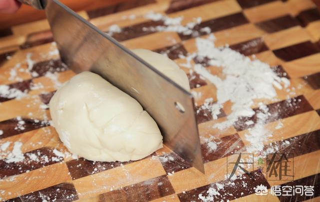 2.将面团包上保鲜膜,醒发半小时。3.将榴莲去核,捣成泥状。4.将面团取出,分成两份。