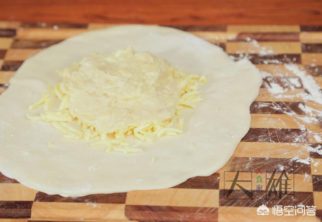 5.取其中一份擀成薄圆饼状,在中间铺一层芝士碎,在铺一层榴莲肉。(另一份照样做就行)