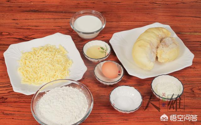 食材:芝士碎150g 、榴莲肉随意、中筋面粉200g 、牛奶110g 、盐2g 、奶粉20g 、油8g 、鸡蛋1个。