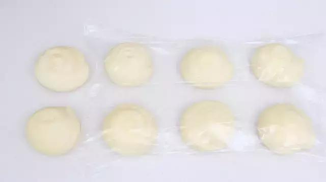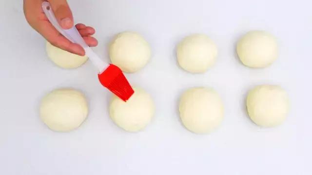 10、将面团按100g分割成8份圆形,表面刷少许食用油后盖保鲜膜松弛15分钟。