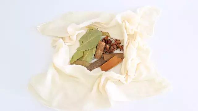 2、香叶、八角、桂皮用纱布打成香料包待用。