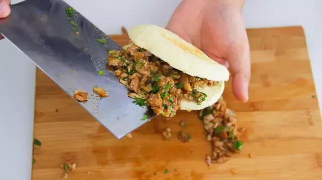 20、将馍剖开一半,填装卤肉。