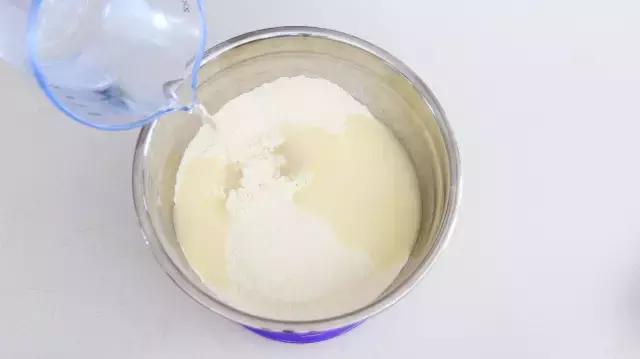 7、面粉、酵母粉、泡打粉、细盐混合均匀后,加入温水。