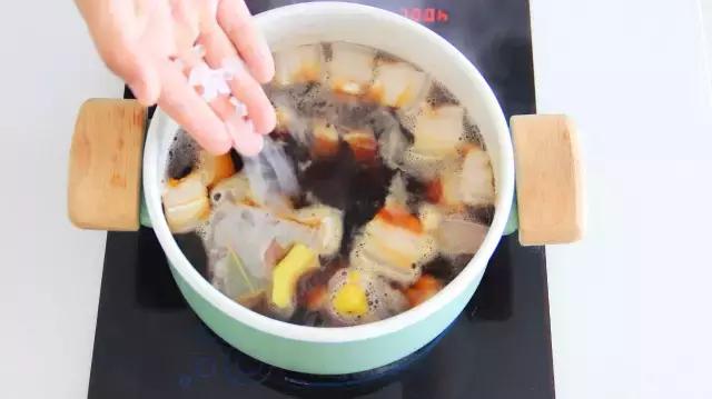 4、放入料酒、细盐、冰糖、生抽、老抽、生姜、香料包。