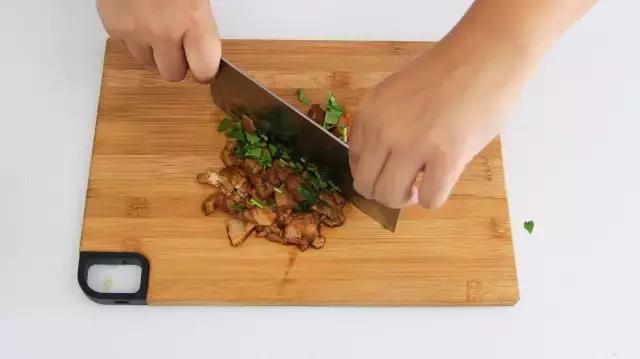 19、卤肉加香菜,浇上肉汤,切碎。