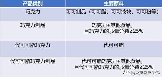 巧克力是以可可制品(可可脂、可可块或可可液块、可可油饼、可可粉)为主要原料,添加或不添加非可可植物脂肪、食糖、乳制品、食品添加剂及食品营养强化剂,经特定工艺制成的在常温下保持固体或半固体状态的食品(注:非可可植物脂肪添加量占总质量分数≤5%)。