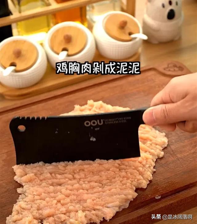 把买来的鸡胸肉剁成泥,然后把鸡胸肉放入碗中