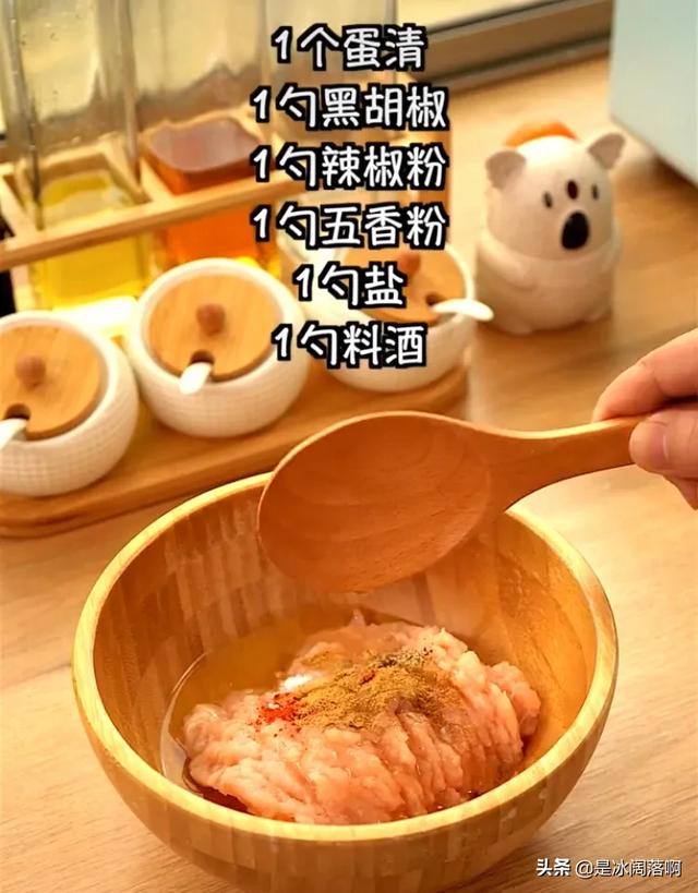 依次加入1个蛋清、1勺黑胡椒、1勺辣椒粉,1勺五香粉、1勺盐、1勺料酒然后抓匀