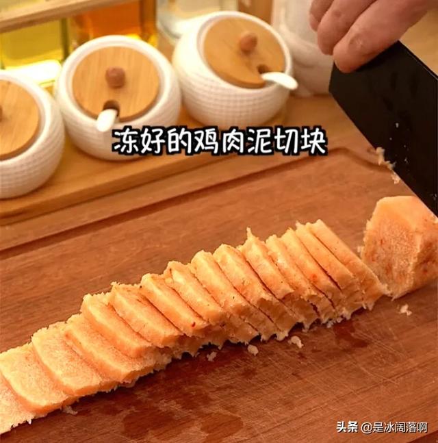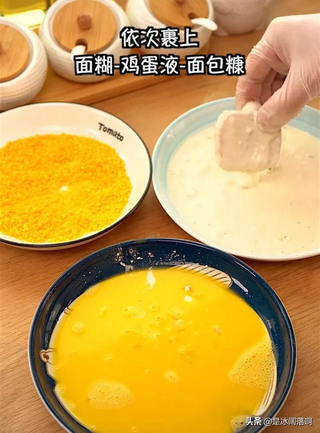 然后把冻好鸡胸肉切成块状,按顺序依次裹上面糊、鸡蛋液、面包糠