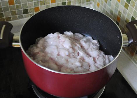 4、不要盖盖子,小火,不断加热。(图中情形基本是水还没有熬干的时候,液体呈白色,待水蒸发掉,油开始析出,锅子边缘的液体就呈现浅黄色。)