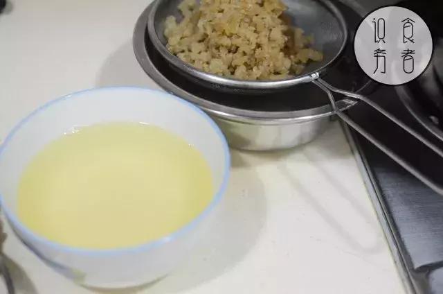 6、待油渣变浅黄色,基本萎缩时,将火关掉,用勺子将油舀出,滤网过滤油渣。(盛器一定要选择耐高温的,有盖子易保存。如果盛器不耐高温,就在锅子里面晾凉再装也可以)