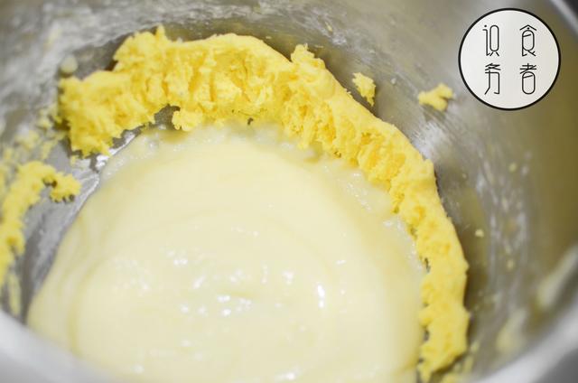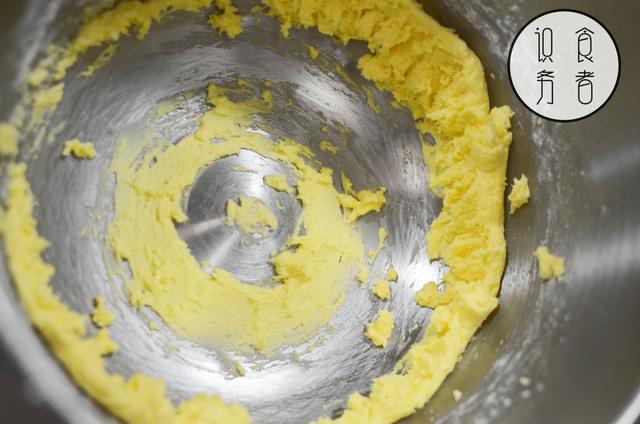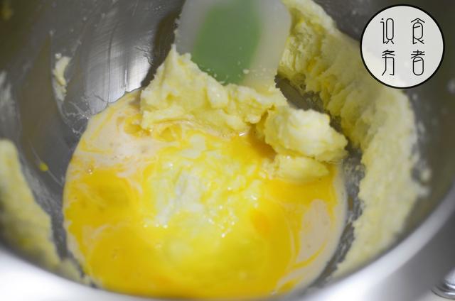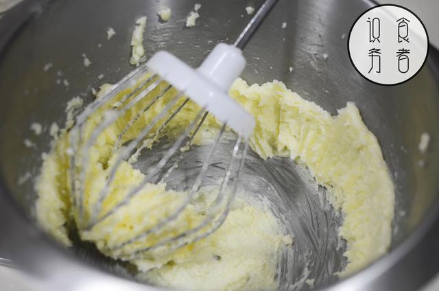 1、牛油放软后加糖、盐打发,分次加入鸡蛋拌匀;