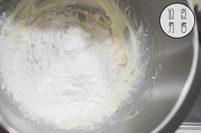 在黄油中加入过筛的100g玉米淀粉、20g吉士粉,稍微搅拌均匀。