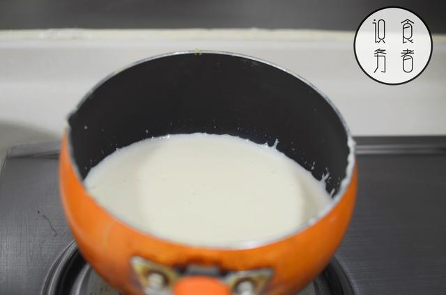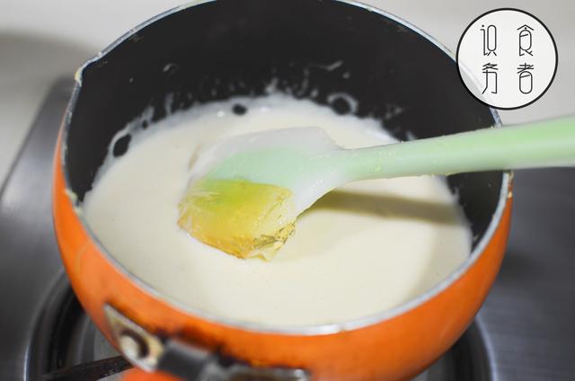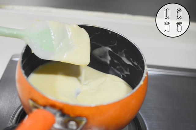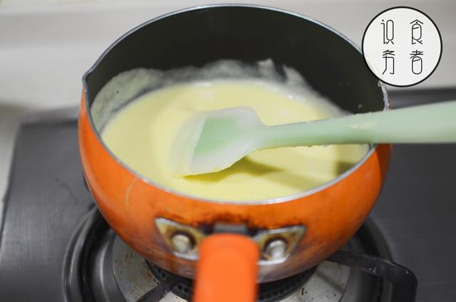 3.将蛋奶液小火加热至浓稠,成蛋奶浆,放凉备用