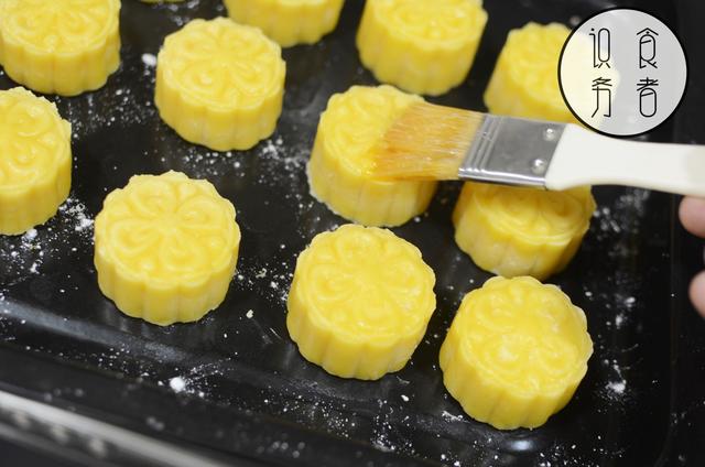 第一次烤6分钟后,拿出来,将轻轻刷一层蛋黄(蘸料1),然后重新放回烤箱。