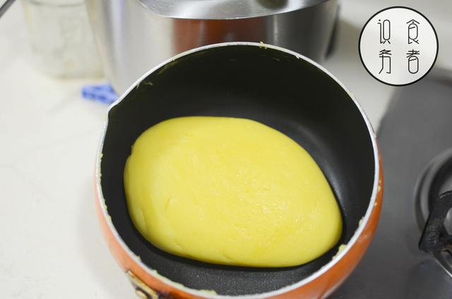 倒入锅中,小火加热,最后收汁后会如奶黄泥一样的固态状态。