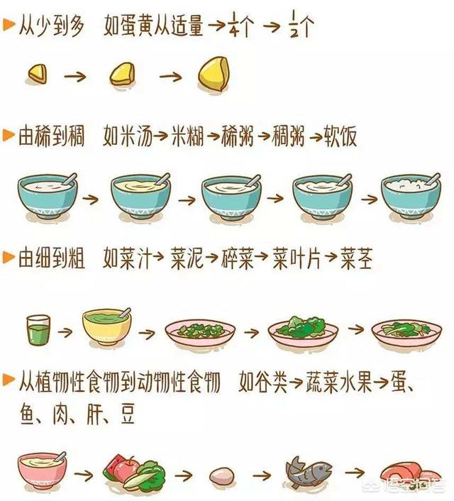 辅食添加原则:每次只添加一种新食物,由少到多、由稀到稠、由细到粗,循序渐进。