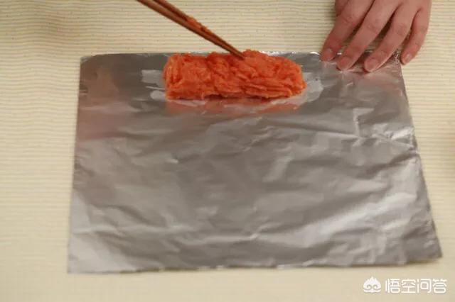 取一张锡纸,盛肉馅放在锡纸一侧,整理成长条形。