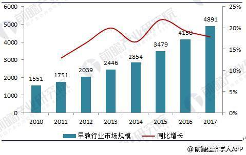 早教的重要性体现在整个早教市场中则表现为国家在政策上的大力支持,如教育部2012年5月发布的《开展0-3岁儿童早期教育试点工作有关事项的通知》,提出将发展0-3岁儿童早期教育列入当地教育发展总体规划;2016年2月,教育部基础教育二司发布《教育部基础教育二司2016年工作要点》,提出要大力发展普惠性早期教育,推进国家早期教育改革发展实验区建设。而且,随着中国居民收入水平的不断提高以及对幼儿进行教育的不断重视,我国早教市场也迎来了较大的发展机遇。据前瞻产业研究院发布的《中国早教行业发展前景预测与投资战略规划分析报告》显示,2017年我国早教市场总体规模已经达到了4891亿元左右,同比增长了17.9%左右。
