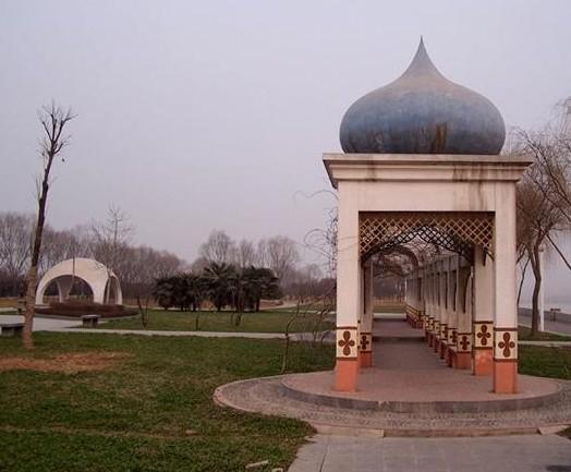 洛浦公园的东入口处,与西入口一样也由内外广场及游园组成,总面积3万余平方米,东大门已成为洛阳的一个标志性建筑物,内广场建有音乐喷泉,花岗岩灯柱、花坛。夏夜在此纳凉可一边欣赏喷泉的水姿,一边聆听悦耳的音乐,下部游园由洛阳八大景之一的“天津晓月”而取名“晓月园”。